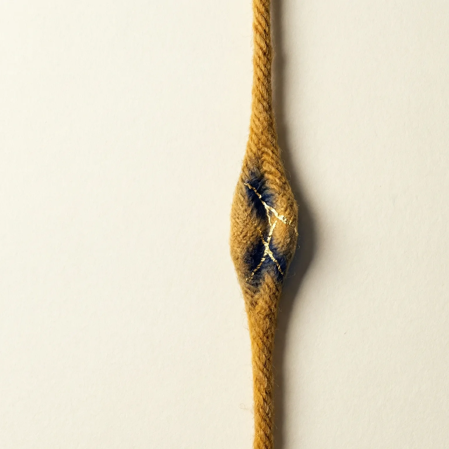 Visual approach: Andean quipu cord structure in ochre and indigo. A single pendant cord shows evidence of having held a knot — the smooth bulge where the knot was removed. Gold kintsugi lines trace this absence, not as repair but as memorial. The gold honors what was excluded.