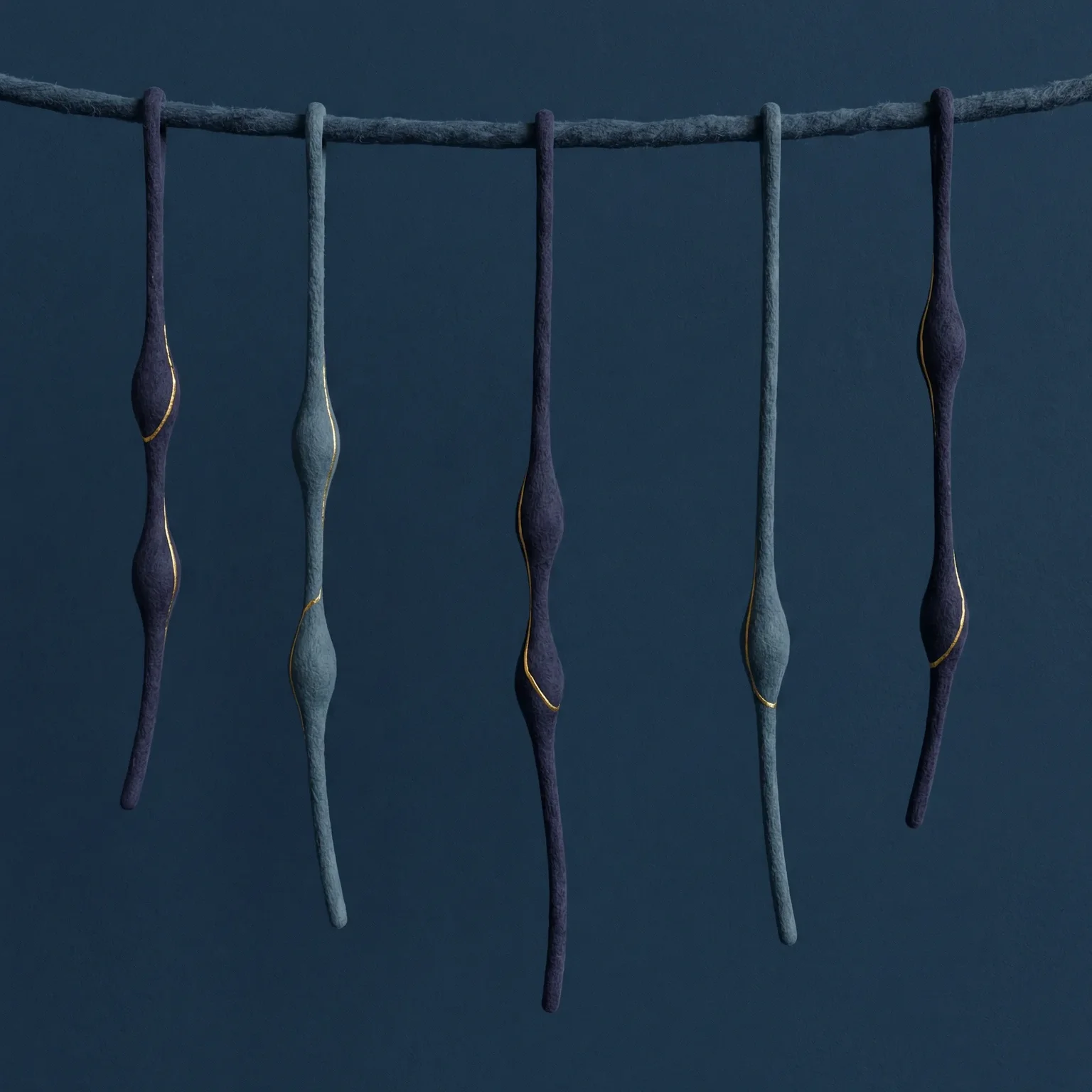 Visual approach: Sparse pendant cords in cool mineral blues and indigo. No knots exist yet — only smooth spindle-shaped thickenings along each cord where knots will form. Gold marks these positions as anticipation, not repair. The composition breathes with deliberate emptiness.