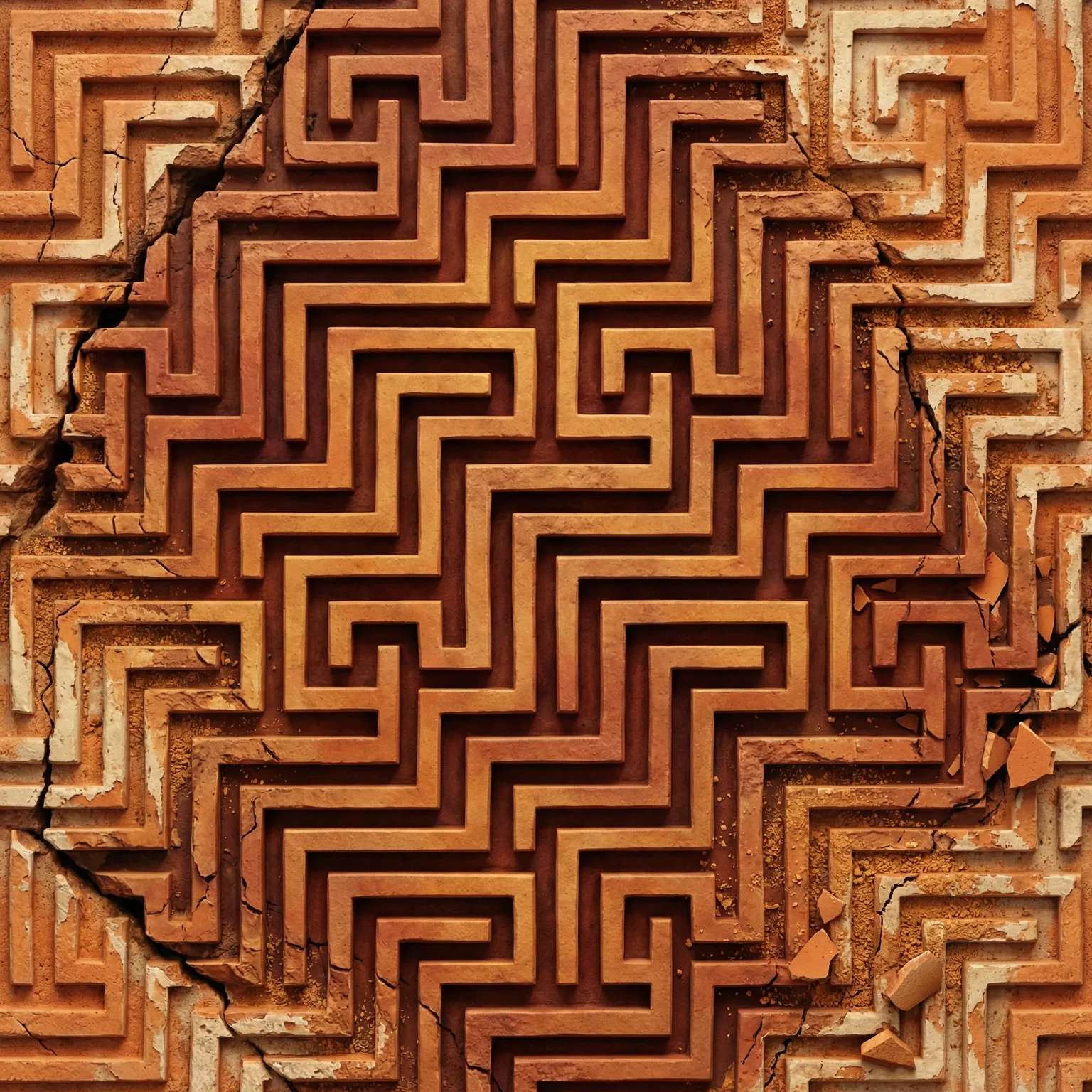 A Mixe-Zoque stepped fret carved into terracotta, precise at center, dissolving at its own edges through physical erosion—cracks, worn surfaces, scattered fragments. Warm earth tones fade from deep reddish-brown to aged parchment where the pattern surrenders.