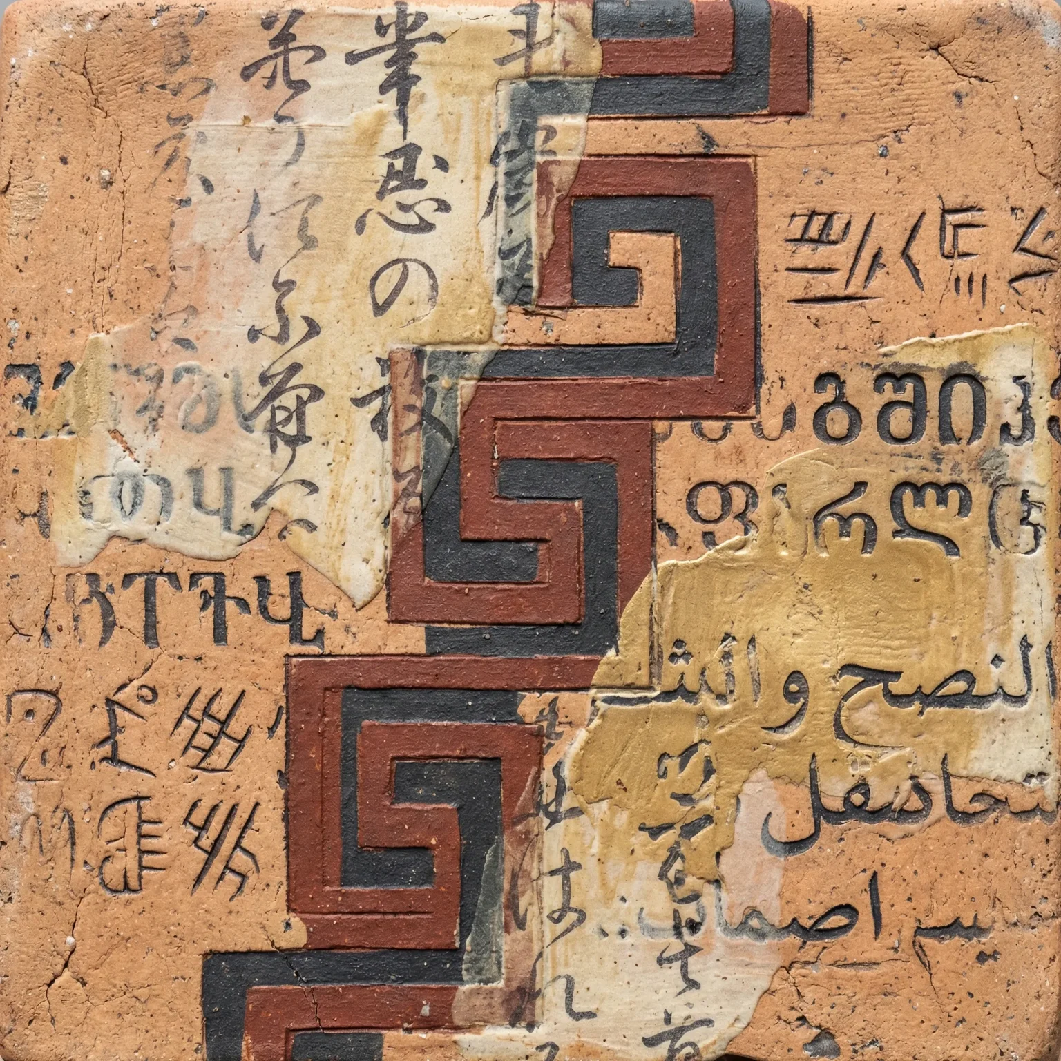 The spine carries the wrong pattern. But the terracotta surface around it is also wrong — not archaeological at all, generated this morning, looking aged without being aged. The whole slab is testimony: the weathering is testimony, the four unreadable scripts are testimony, the Greek key is testimony. The work is a record of what the model produced when asked for Mixe-Zoque patterning across a surface that looks ancient but is not.