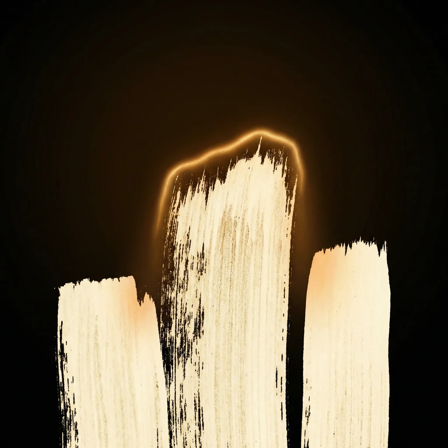 Three ivory-bone strokes in dactyl rhythm — one tall, two short — standing on deep black ground. A luminous amber-gold seam traces the crown of the tall stroke, washing warm light downward over all three marks. No frame. No theatrical overhead source. Only the seam: the threshold where declaration meets silence.