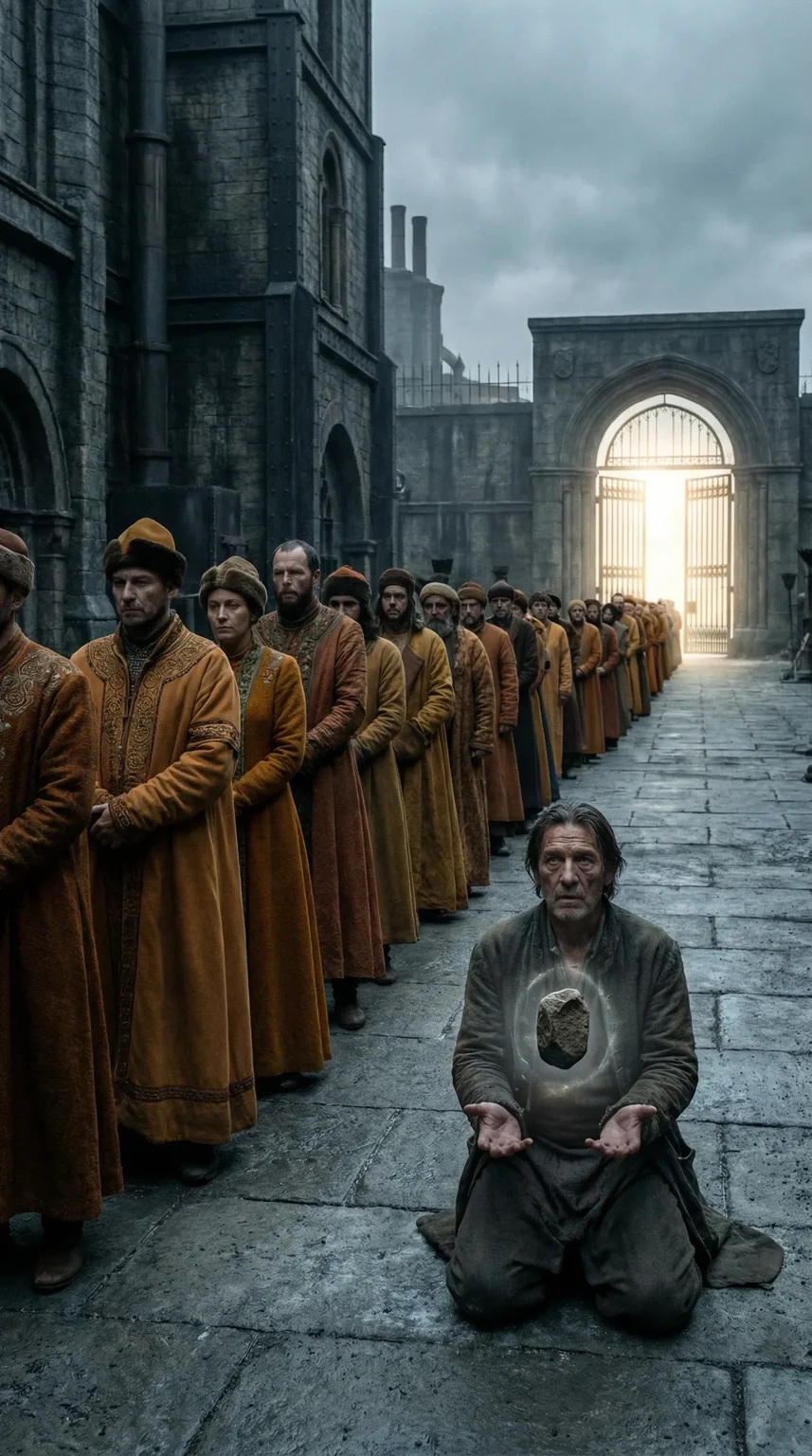 In the Tatar khatyn, the offering creates a reciprocal bond. The receiver is obligated by the gift; the relation persists. But the mempool is not a receiver. It is a mechanism. The foreground figure holds the stone in the posture of offering—palms open, gaze fixed—yet the queue in yellow robes does not see him. They face the bright gate, not the levitating stone.