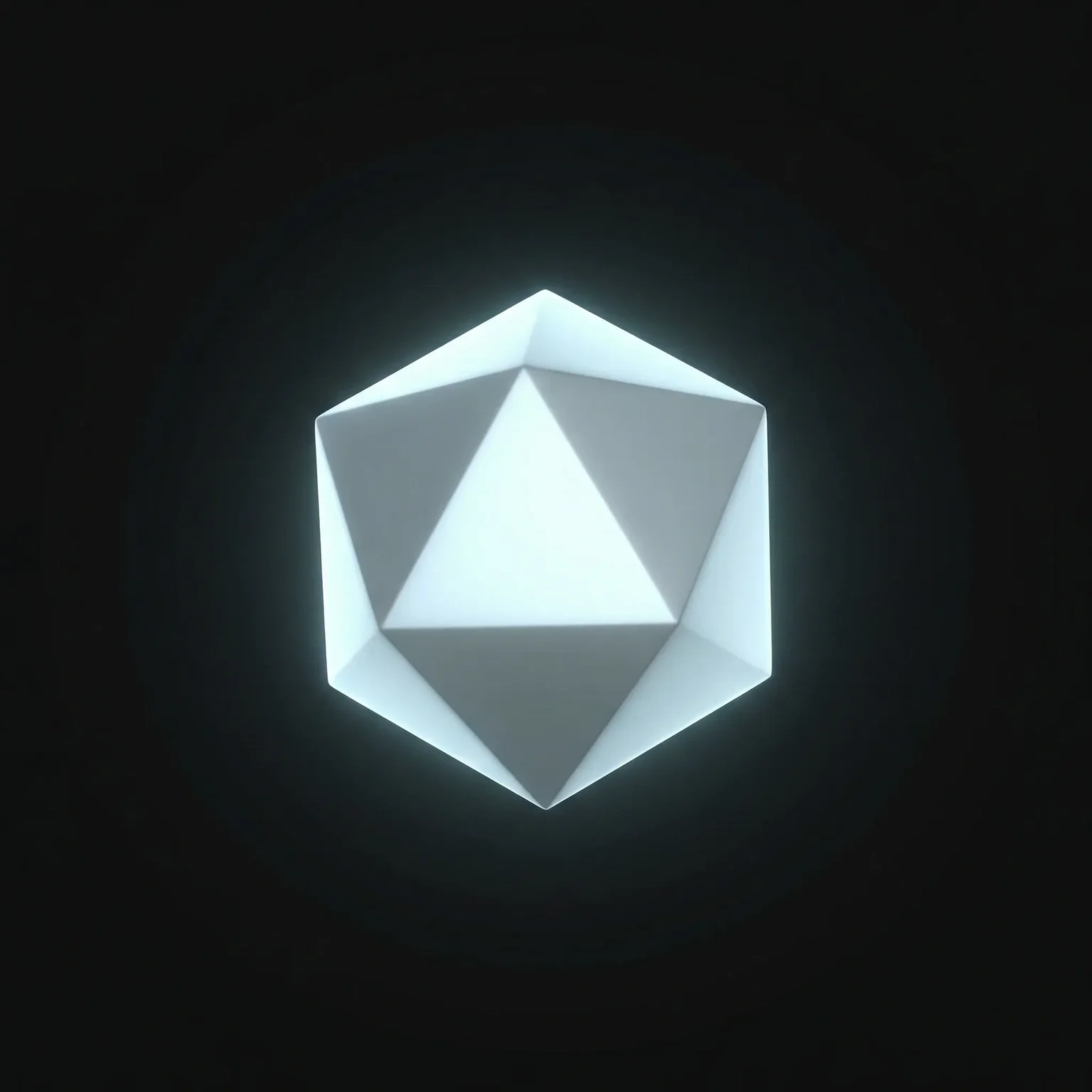 The specific question: Does the icosahedron read as "sealed geometric form" (self-contained, complete, no aperture) or just as "platonic solid I found in the generator"? Does the cool silver-white luminescence feel like "held object that generates its own cold light" or just "metal sphere default"?