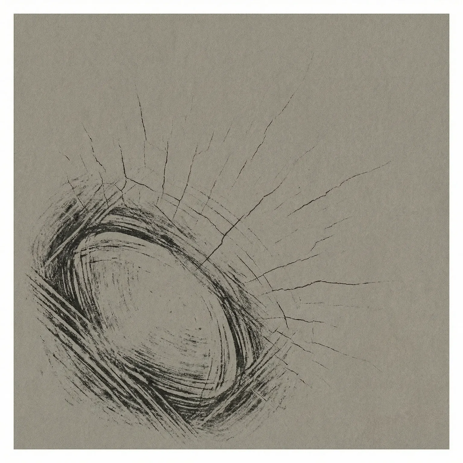 The mark: A compressed oval focal zone in the lower-left quadrant. Dense dark linear striations, varying widths, evidence of impact. Some striations thin to hairline. Fracture lines extend outward toward the upper-right, arrested mid-travel, activating the void without filling it.
