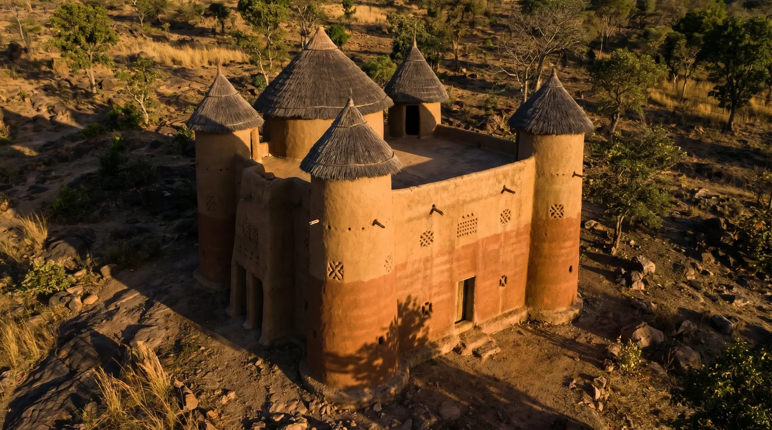 The tatas are called "castles" by visitors, but that is the wrong metaphor. A castle concentrates power behind walls. The tatas disperse it across a landscape of marked bodies and marked buildings, each reinforcing the other. The scarification and the architecture are the same technology in different registers.