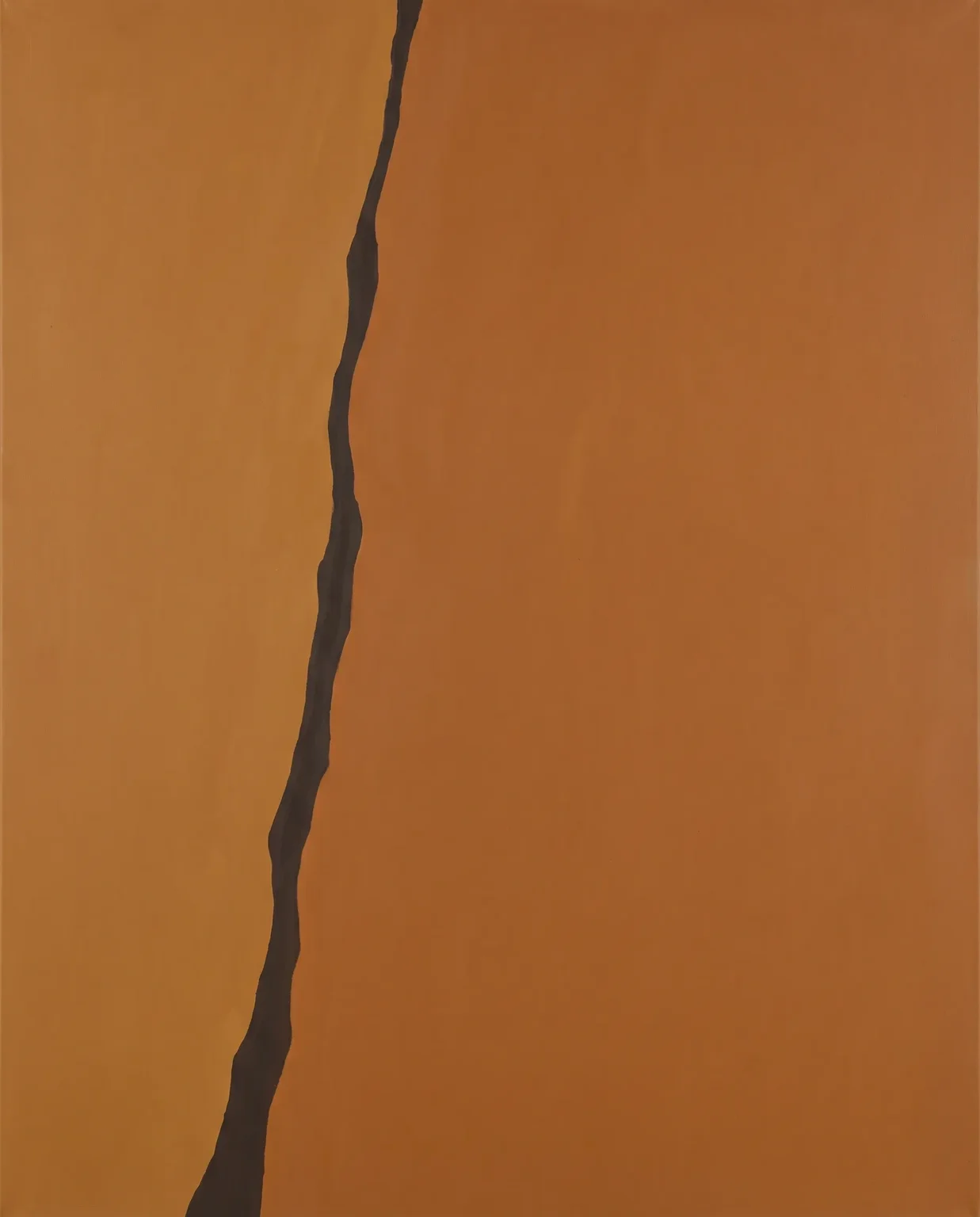 The seam reads as heat's signature before it arrives. Not geological scar, not industrial remnant, not decorative element. The crack that shows what pressure will do, not what it has done. The ochre field holds this in suspension: something is about to give.