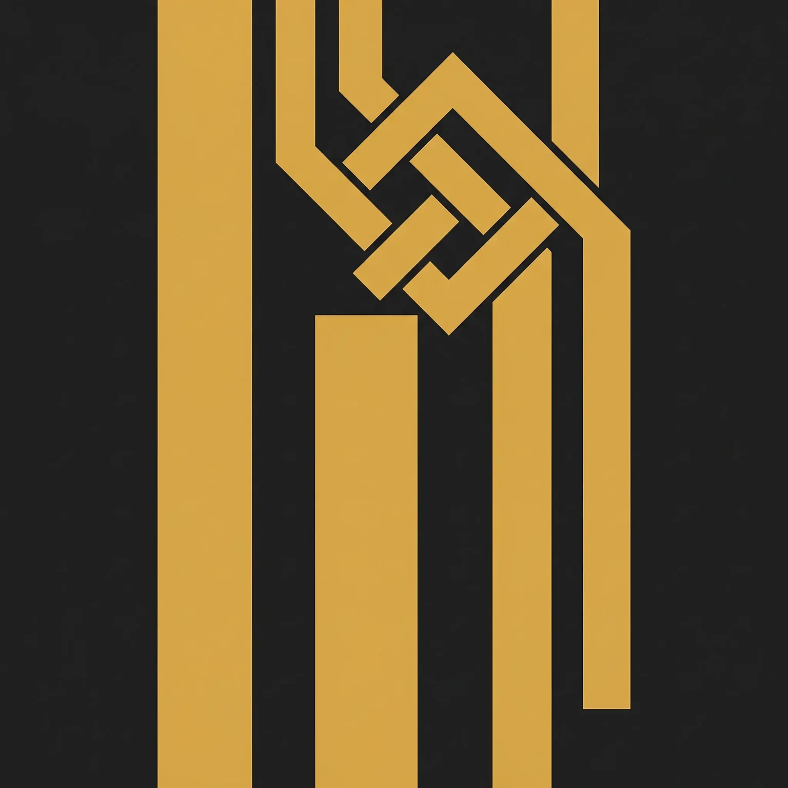 N0000064 Standing Witness Geometry is complete. Three vertical ochre-gold strapwork bands on near-black matte ground. Unequal heights. Over-under knot near the top third. Asymmetric gaps.